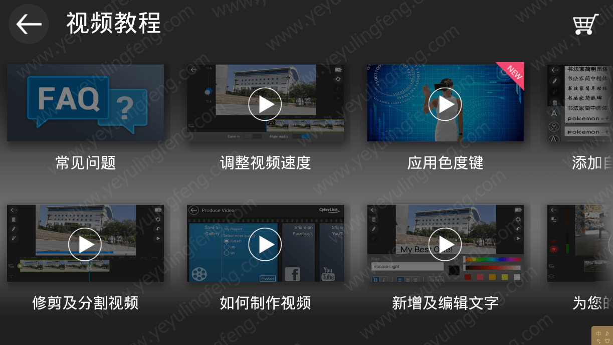 尽管PowerDirector操作界面已经非常简单明了,初次编辑视频难免会遇到一些操作方面的小问题,或者熟悉操作软件功能后想要进一步的进阶学习,PowerDirector网上操作教程比较少再加上移动端视频编辑应用的稀缺,遇到问题往往会不知所措。这里老夜就重点强调PowerDirector的又一大贴心功能,从基础到进阶再到大成的视频教程均可以在应用内观看学习,视频均为官方针对该工具出品可谓是非常的详细,是菜鸟速成的不二首选。