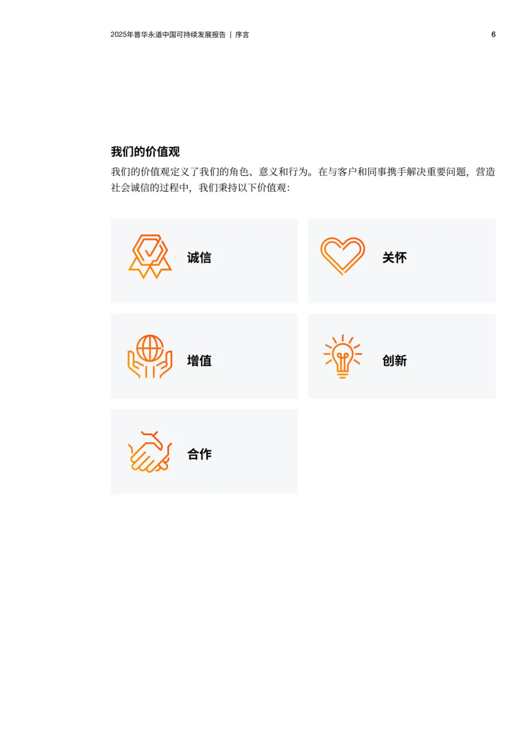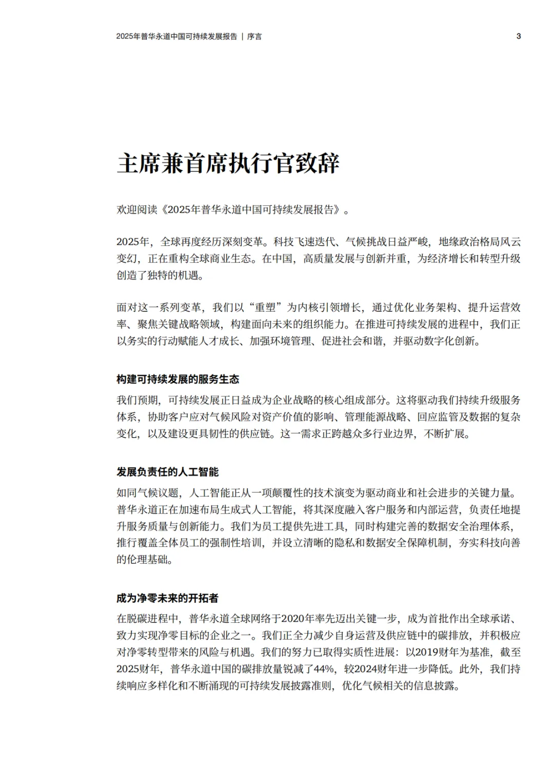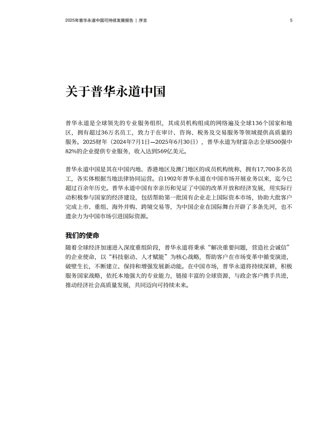 这份《2025年普华永道中国可持续发展报告》系统阐述了普华永道中国在2024年7月1日至2025年6月30日财年期间,在环境、员工、社会及治理方面的战略、行动与成效。核心内容概括如下: