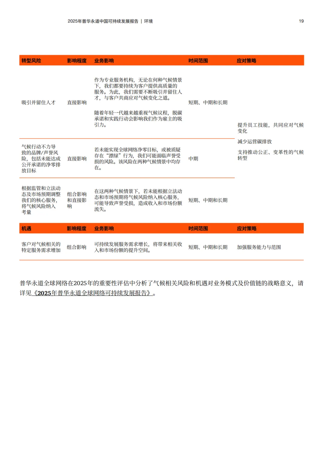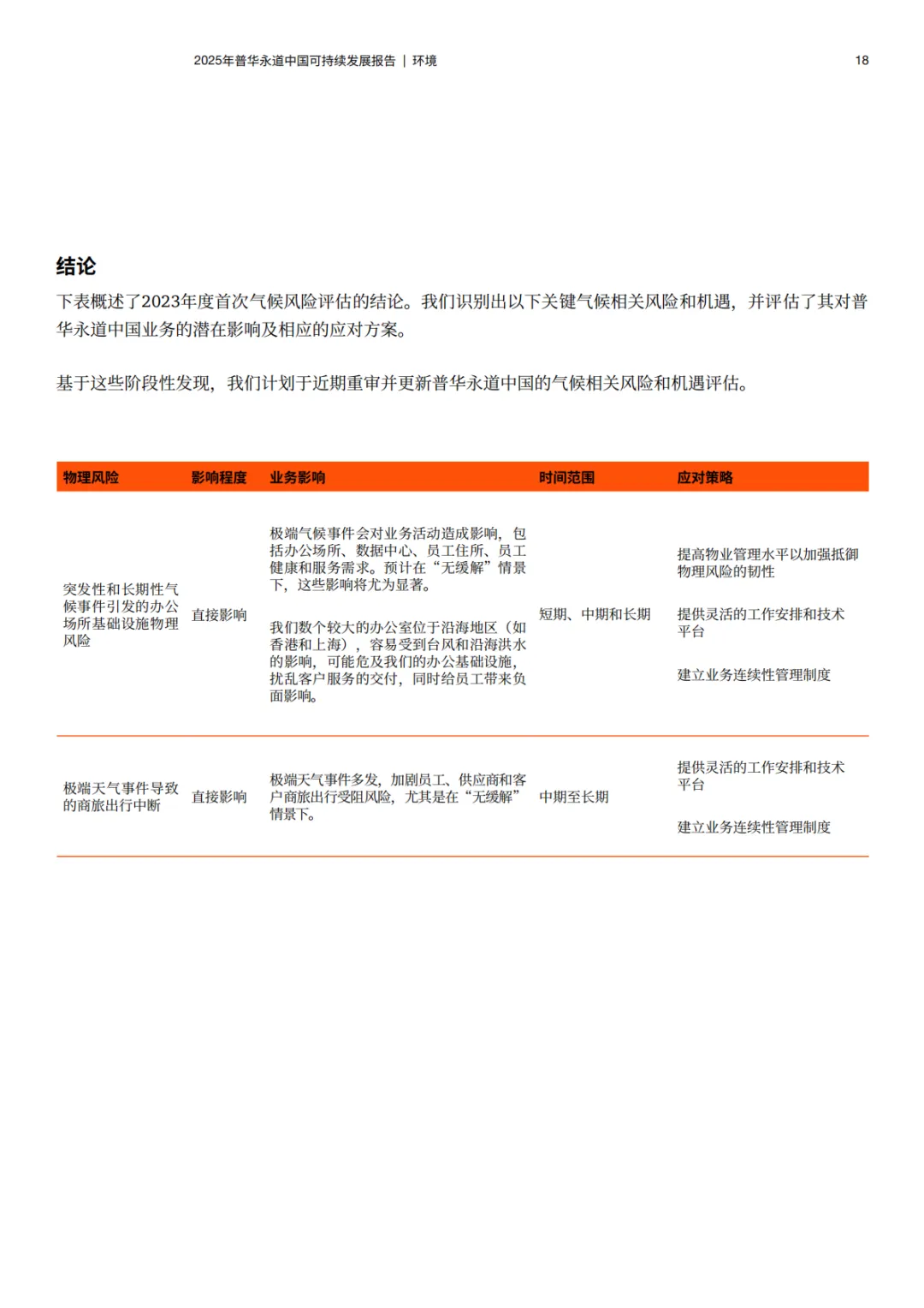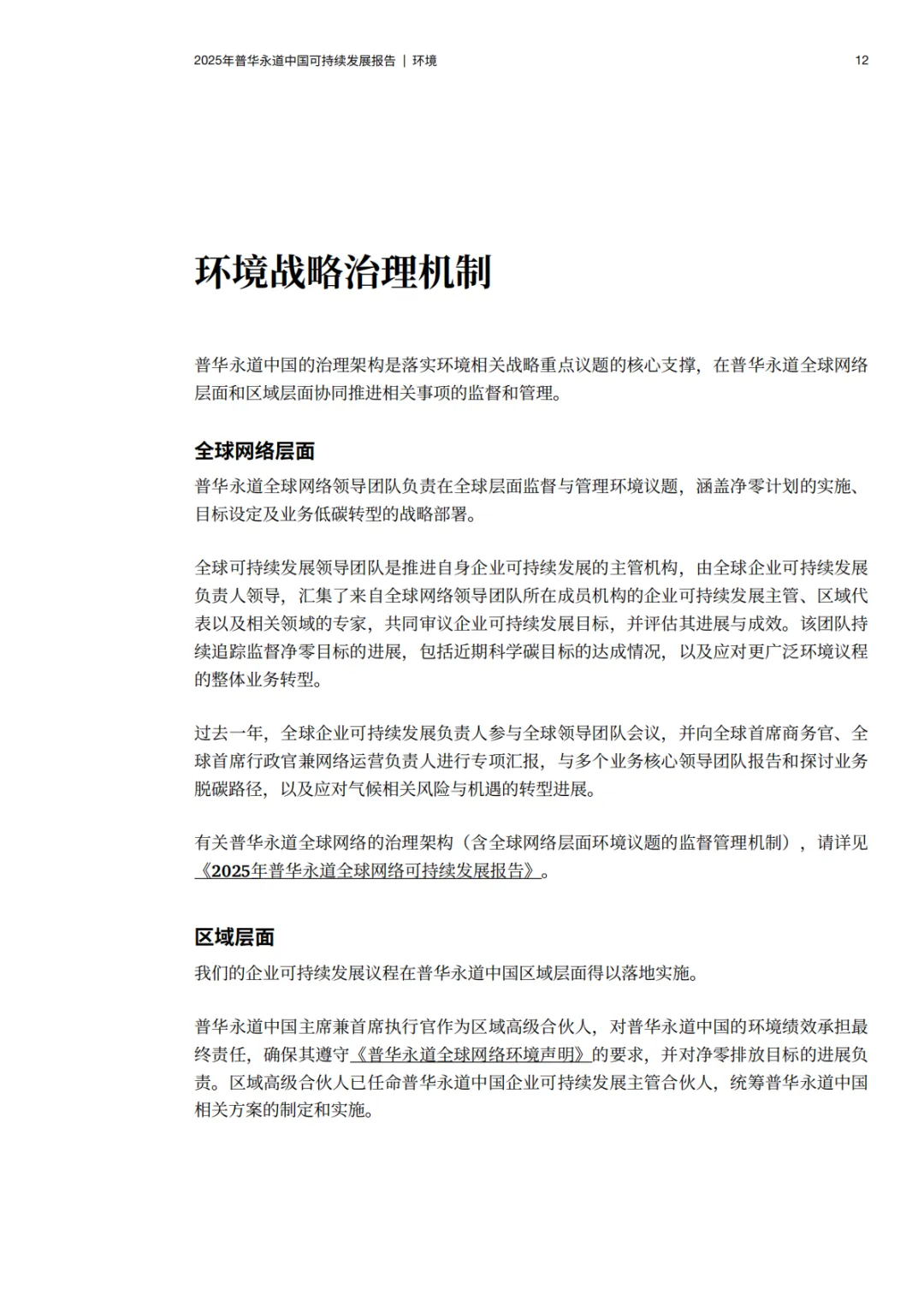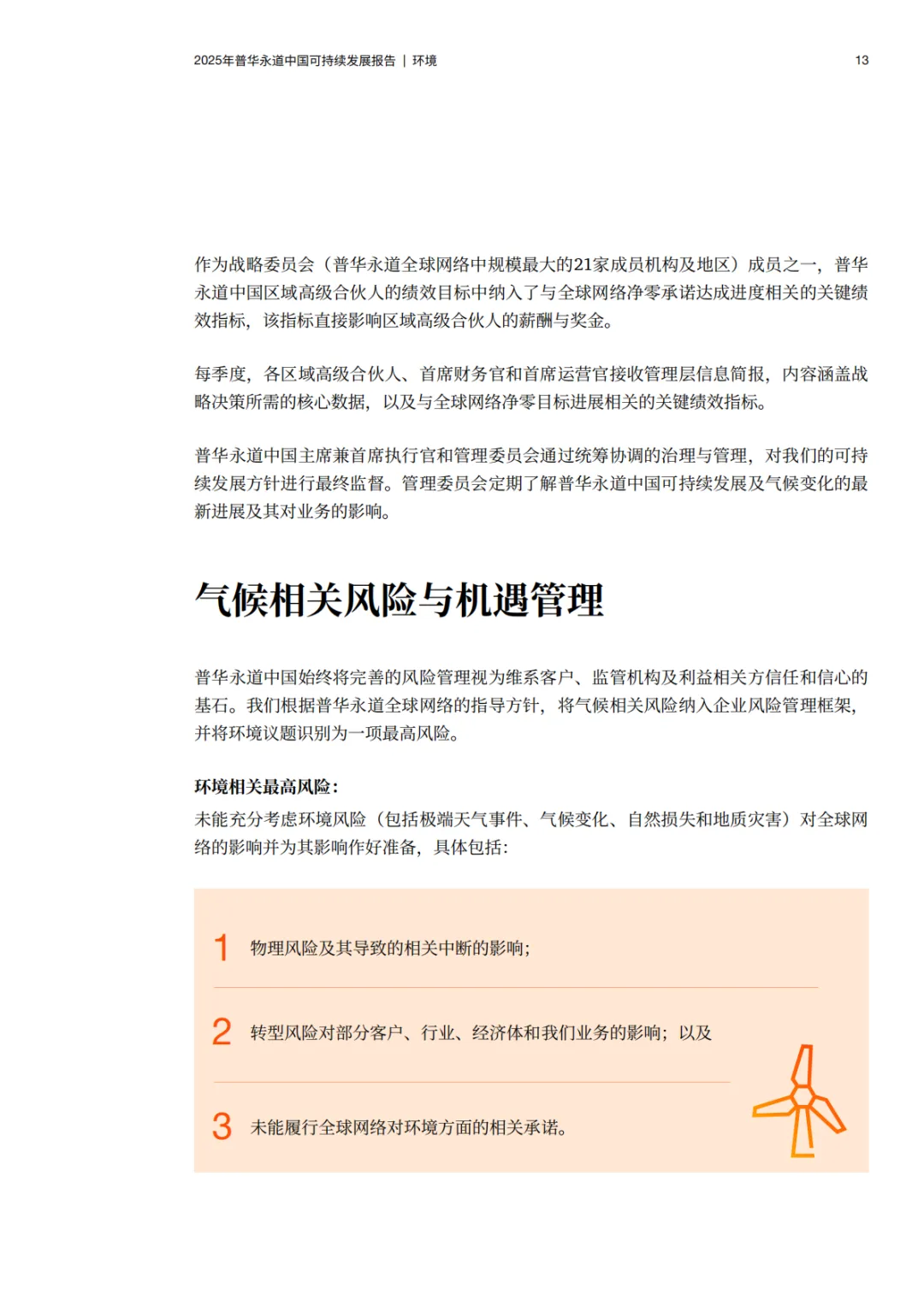 治理机制:环境绩效纳入区域高级合伙人考核,由管理委员会最终监督;气候风险被识别为最高风险之一,纳入企业风险管理框架。