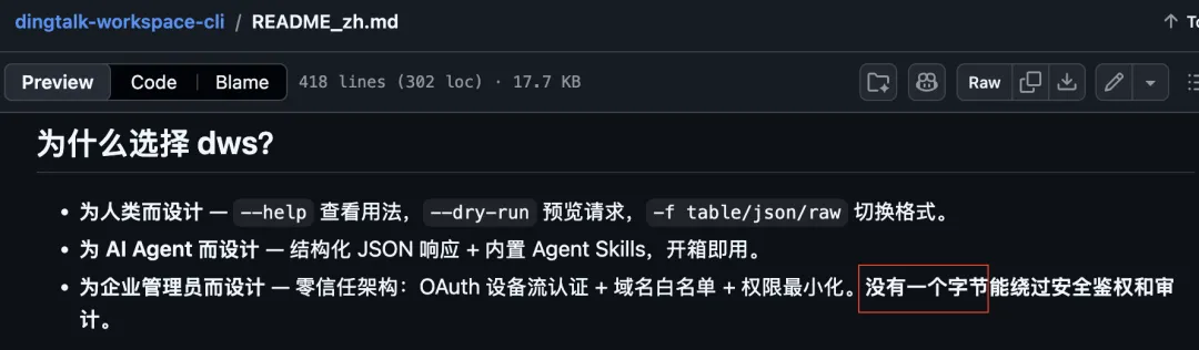 钉钉CLI其实是最早发布的,但不到1天就被飞书赶上了,还要进群申请,所以我最后才试。有更多付费客户群的总是更谨慎,我觉得下面这句话是在内涵其它厂商。。。