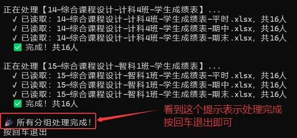 • 提示用户看到”所有分组处理完成!”后,按回车退出程序。
