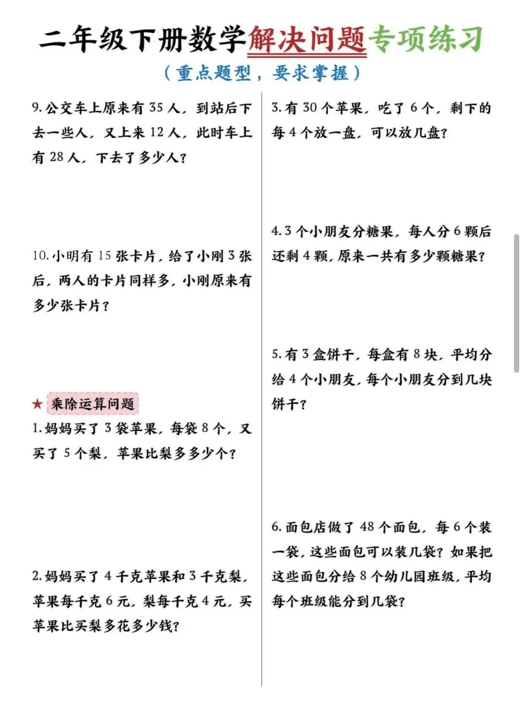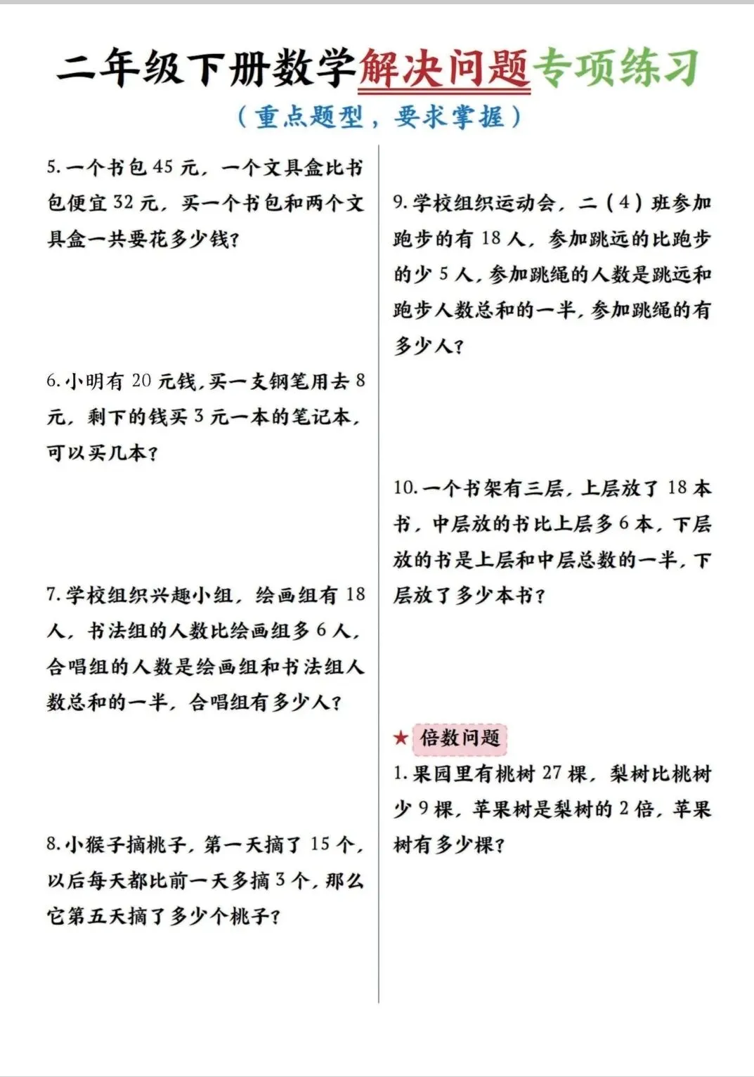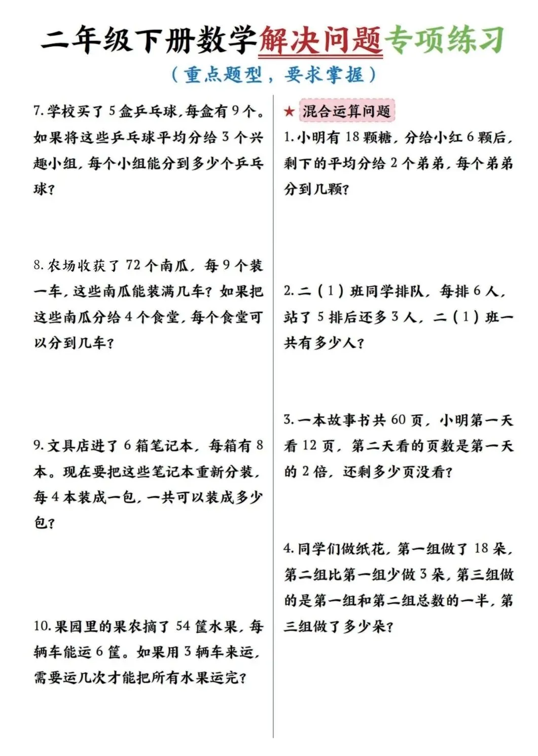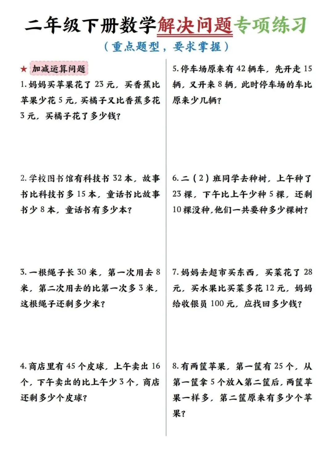 二年级下数学解决问题专项练习(可打印)