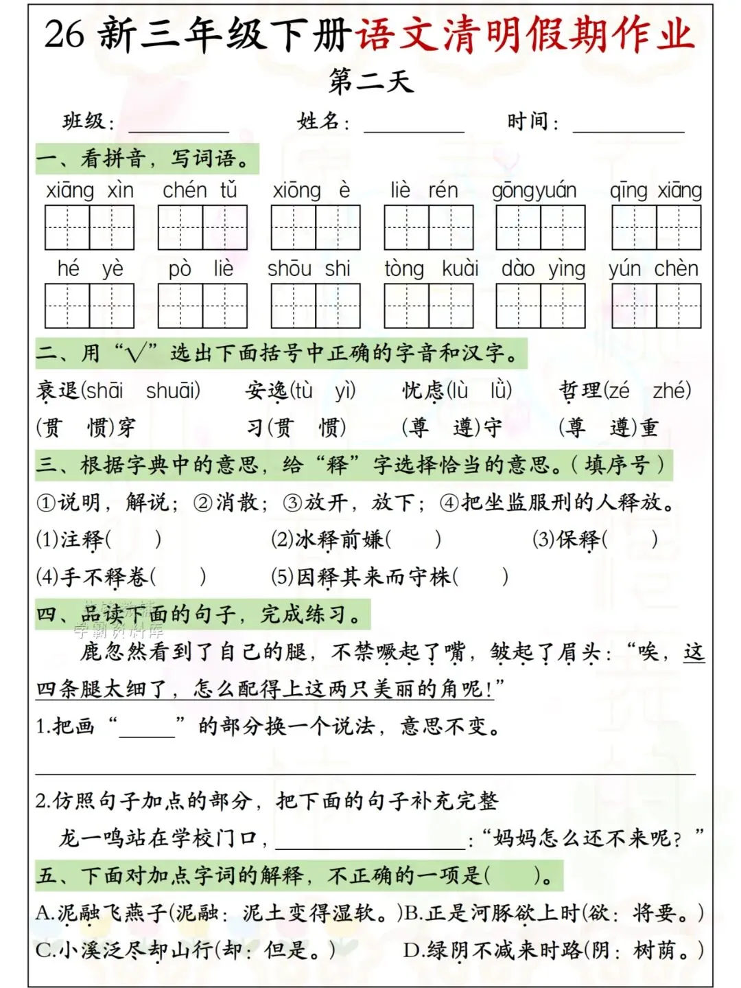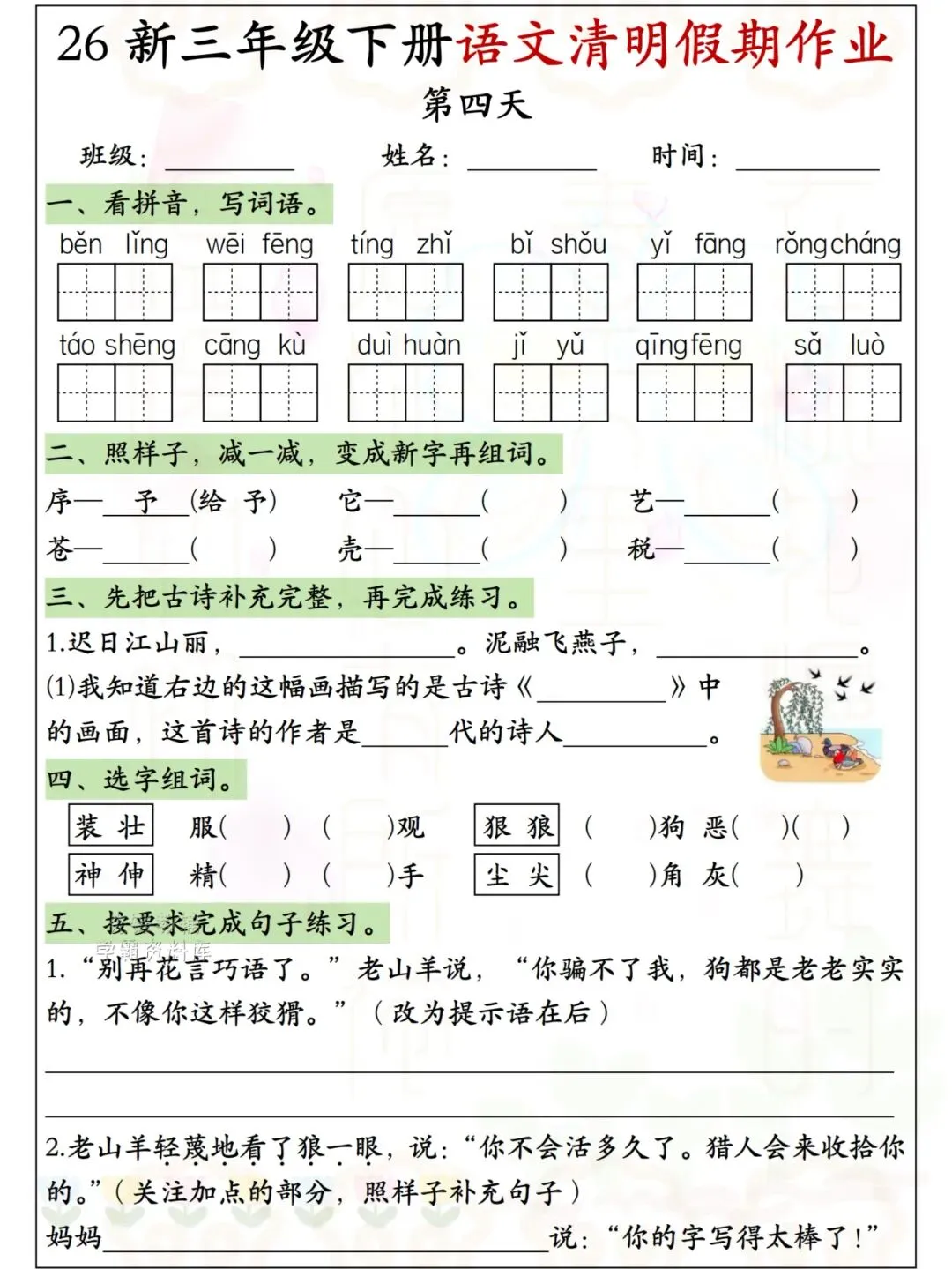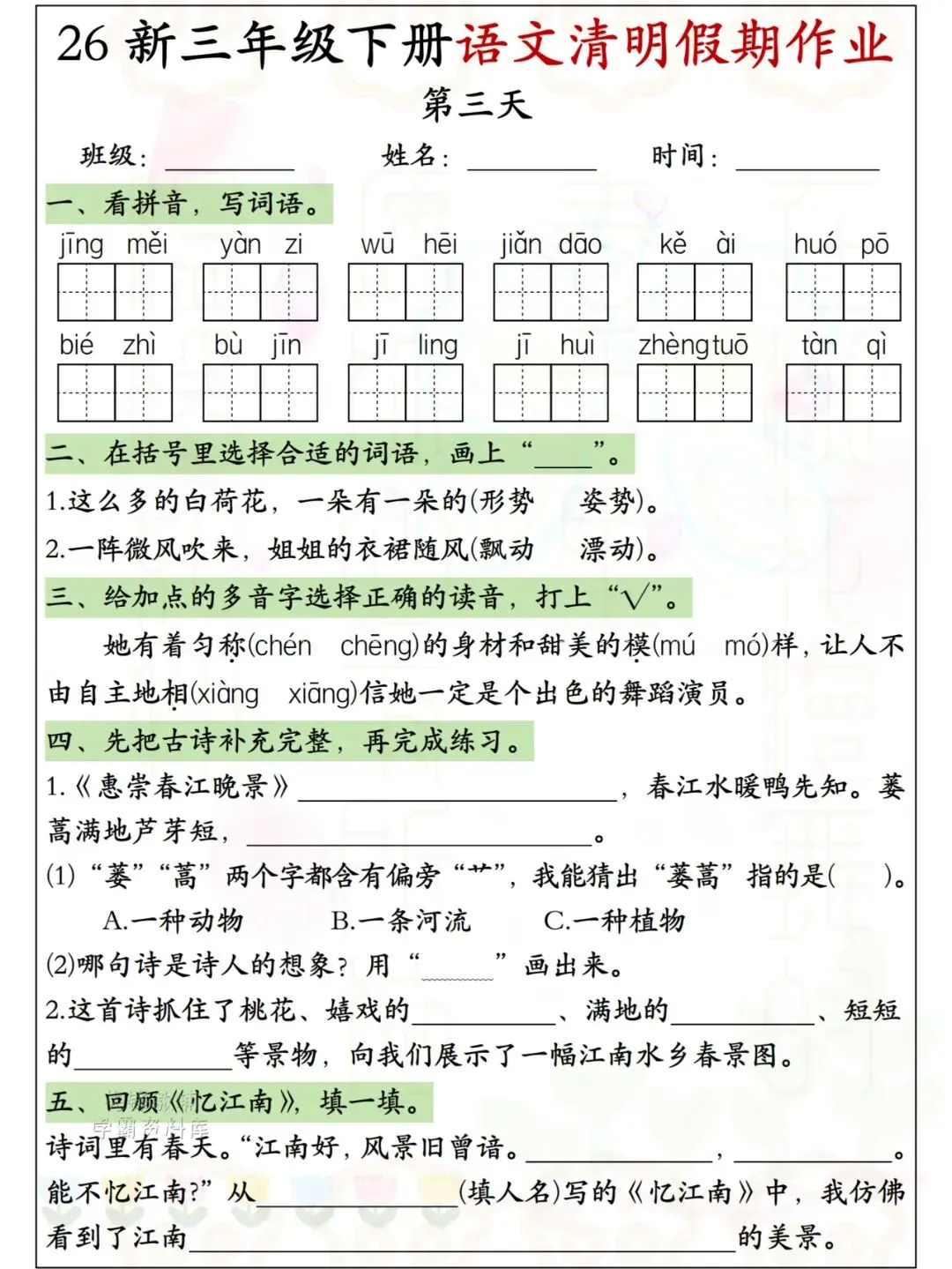 26新三年级下册语文清明假期作业 电子版可下载可打印