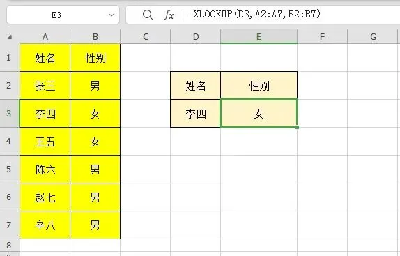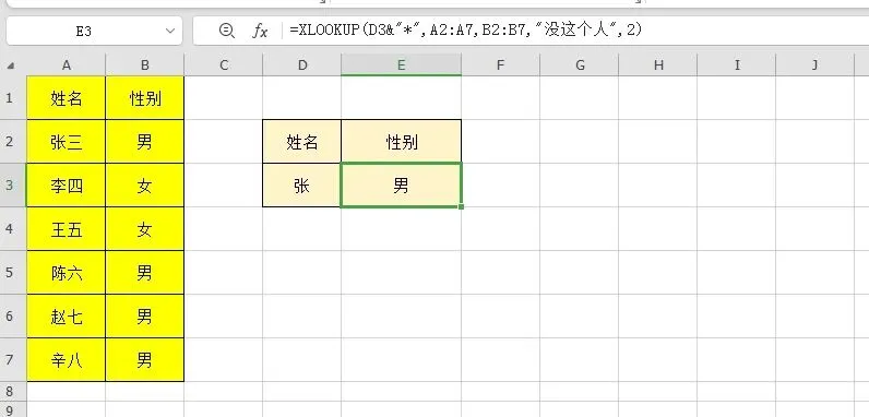 例如要查找姓张的性别,不可以向VLOOKUP那样,可以直接用通配符来查找,XLOOKUP默认是不支持通配符的,需要在第5个参数来设置,才可以使用。