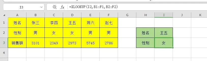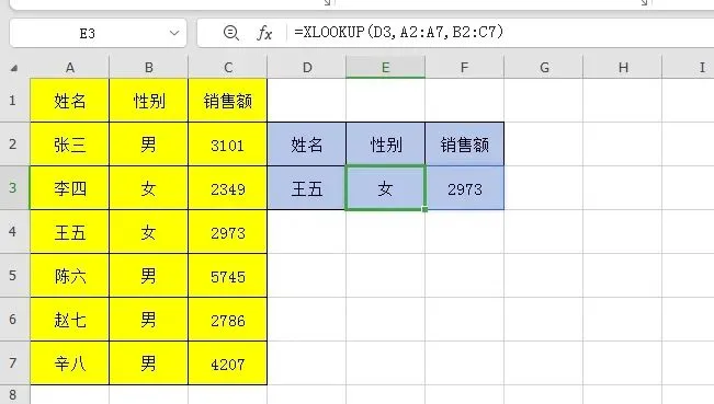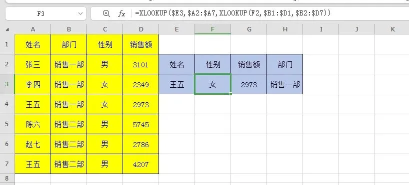查找姓名同时返回性别和销售额,不用再像VLOOKUP那样,需要设置第3个参数用COLUMN来动态获取。