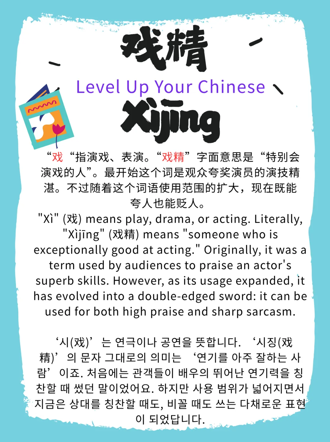 Lily가 전에 ‘아부쟁이(마피징)’와 ‘레몬 요정(닝멍징)’을 소개해 드렸죠. 오늘은 때로는 박수갈채를 보내게 하고, 때로는 어처구니없어 웃음만 나오게 하는 ‘시징(戏精)’이 무슨 뜻인지 함께 알아볼까요!