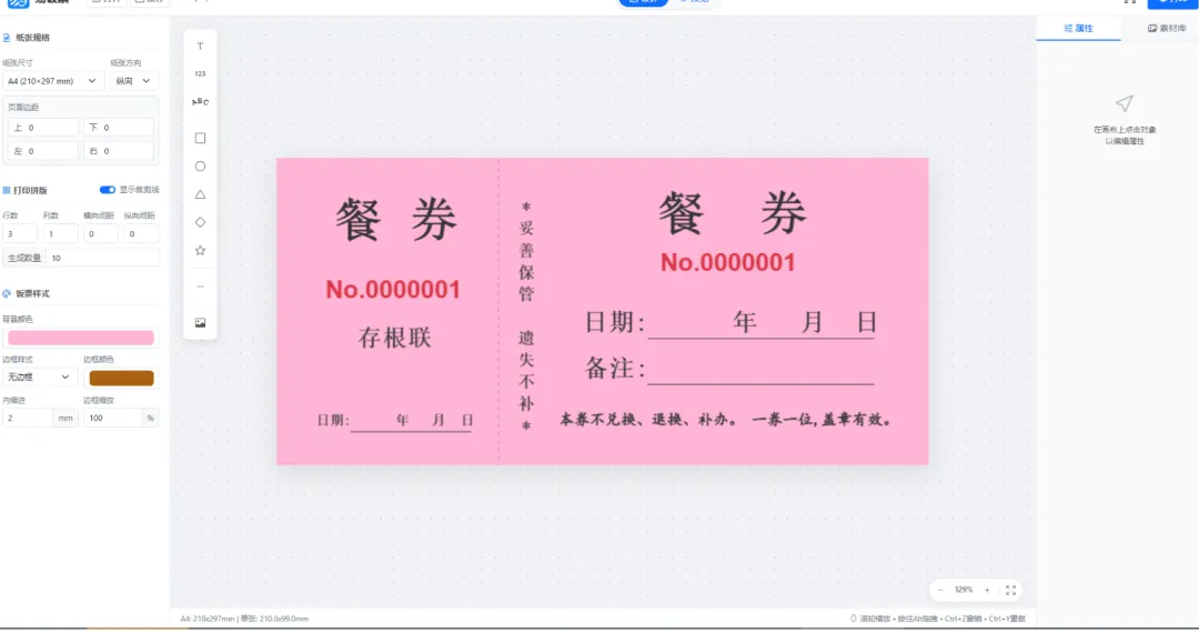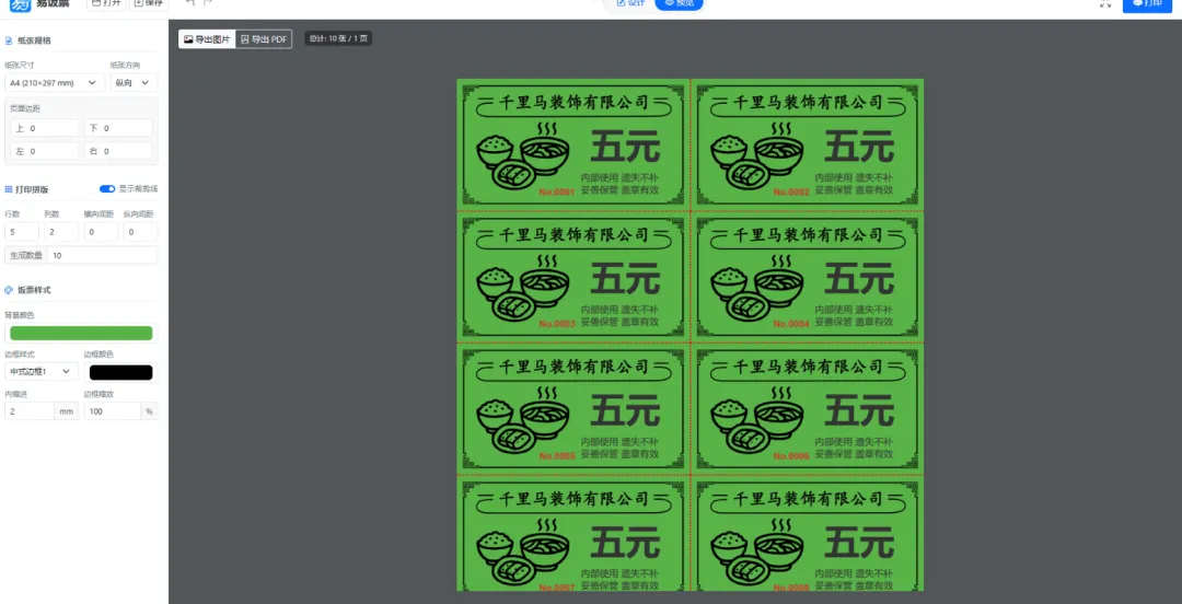 「易饭票」的逻辑完全不同:你只需要设计一张“母版”,设定好纸张大小(A3/A4/A5等)、行数、列数和打印总量,它就会自动帮你完成所有“高密度拼版”,最大化利用每一张纸,连裁剪线都自动生成好了。
