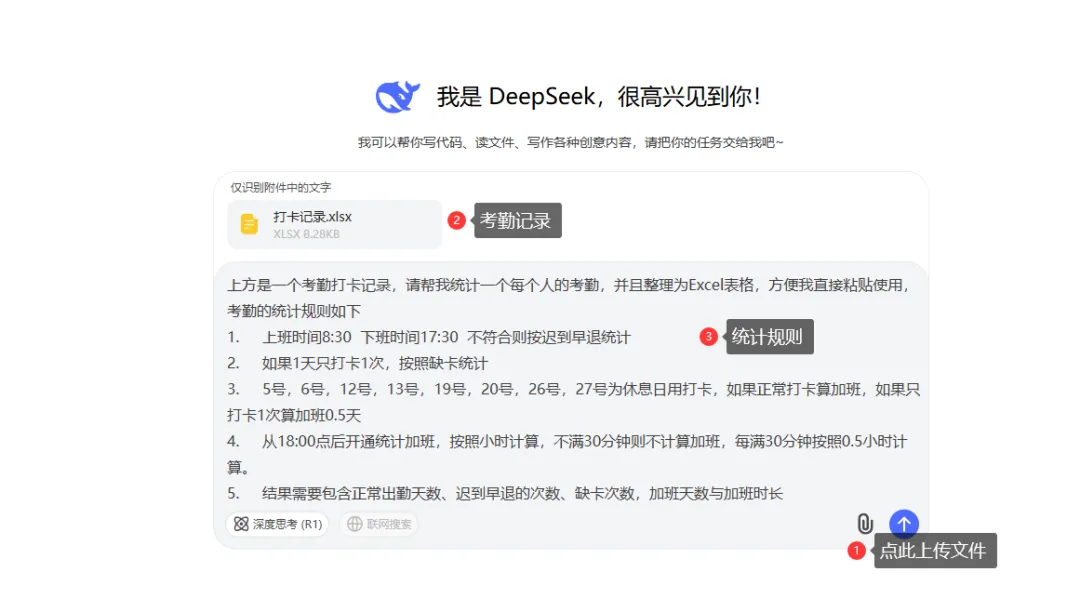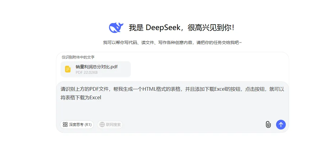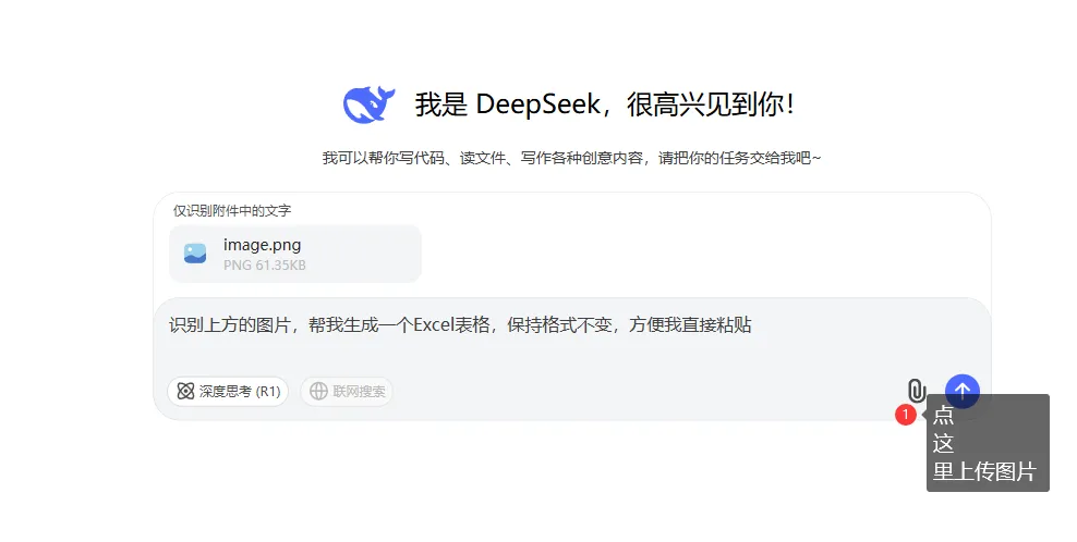 需要将文件上传给Deepsek,然后直接复制下方的提示词,Deepsek 就可以将图片转换为表格,直接粘贴即可