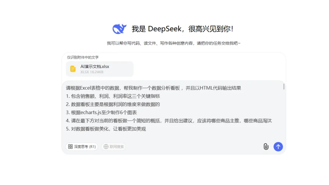 用Deepsek也能生成数据看板,但是数据最大录入8000tk左右,如果你的数据量比较大就不适合了,只需仿照下方的提示词,根据自己的需要来做修改即可