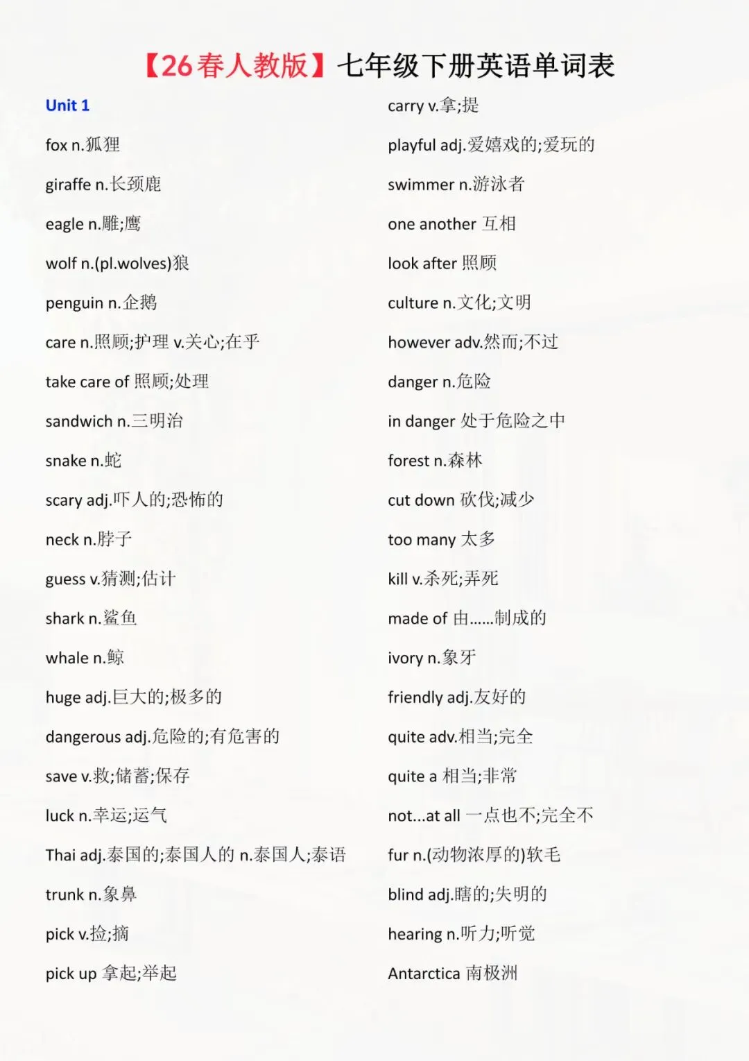今天老师为大家精心整理好了:七年级下册英语 人教版单词表 电子版可打印!