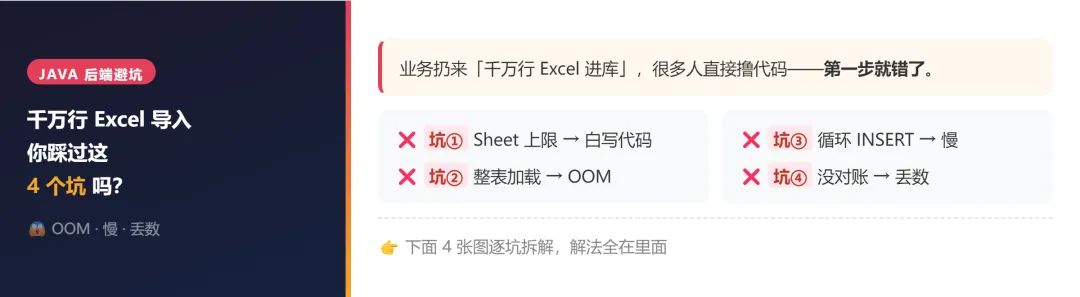 业务扔过来一句「这个 Excel 要导进库,一千万行」。大多数人直接开始撸代码,结果第一步就错了:单 Sheet 根本装不下。这篇把 OOM、慢、丢数三个根本原因和对应方案说清楚,不绕弯子。
