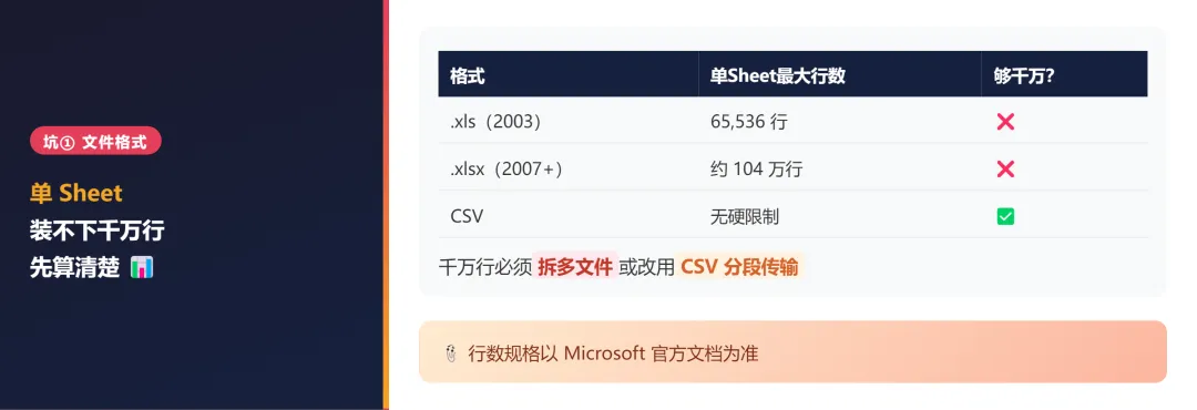 千万行必须拆多 Sheet或拆多文件,或改用 CSV 分段传输。行数规格以 Microsoft 官方文档 为准。