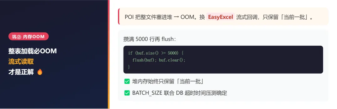 用 POI 一次性把文件读成 List 是 OOM 的直接原因。换 EasyExcel(github.com/alibaba/easyexcel)做流式回调,每攒够一批就落库,堆内存始终可控: