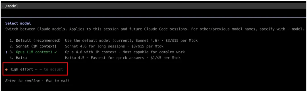 Opus 4.6 引入了 Adaptive Thinking(自适应思考)——Claude 会根据任务复杂度自动调整推理深度,在 Claude Code 里你通过 effort level 来手动控制。
