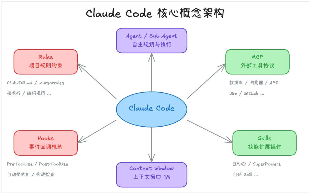 your-project/├── CLAUDE.md # 项目级指令(团队共享,提交到 Git)├── .claude/│ ├── settings.json # 项目设置(团队共享)│ │ └── 包含 Hooks 配置、权限设置、环境变量等│ ├── settings.local.json # 个人项目设置(gitignore)│ │ └── 个人 API 密钥、本地路径等敏感信息│ ├── rules/ # Rules:模块化规则文件│ │ ├── code-style.md # 代码风格规范│ │ ├── testing.md # 测试规范│ │ ├── security.md # 安全要求│ │ └── performance.md # 性能要求│ ├── agents/ # Agent:自定义子代理配置│ │ ├── code-reviewer.md # 代码审查 Agent│ │ ├── qa.md # 调试 Agent│ │ ├── frontend-dev.md # 前端开发 Agent│ │ └── backend-dev.md # 后端开发 Agent│ ├── skills/ # Skills:自定义技能│ │ ├── tdd-workflow/ # TDD 工作流技能│ │ │ └── SKILL.md│ │ ├── fix-issue/ # Bug 修复技能│ │ │ └── SKILL.md│ │ └── prd-reverse/ # PRD 逆向生成技能│ │ └── SKILL.md│ ├── hooks/ # Hooks:事件钩子脚本│ │ ├── pre-tool-use.sh # 工具调用前执行│ │ ├── post-tool-use.sh # 工具调用后执行│ │ └── notification.sh # 通知事件处理├── .mcp.json # MCP:项目级 MCP 服务器配置│ └── 配置数据库、浏览器、API 等外部工具连接