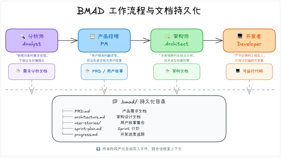 BMAD 的做法是把 AI 的”记忆”写到文件里。每个阶段的产出都落盘成文档,下次启动时 AI 读这些文档就能接上。