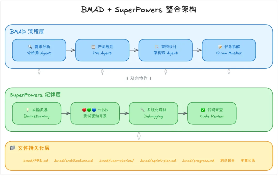 • 在 BMAD 的编码阶段,强制使用 SuperPowers 的 TDD 和调试技能 -