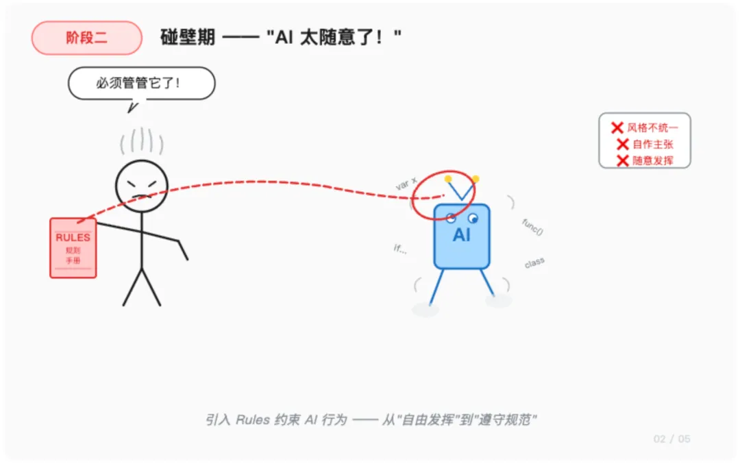 发现 AI 太随意之后,我们开始在项目里写 Rules 文件,此时AI 的输出开始收敛,至少不会再随意切换技术栈了。