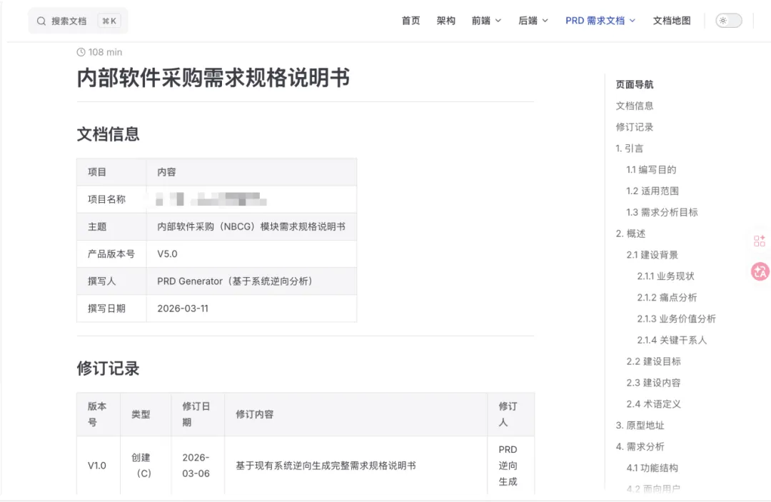 多个已上线系统的历史 PRD 文档已丢失或严重过时,业务逻辑长期依赖代码和口头传承。为此自研 prd-reverse Skill,基于现有代码库进行自动化逆向分析,生成标准化 PRD,实现”代码即文档”——让历史系统中的业务逻辑以结构化、可阅读、可维护的方式沉淀下来。目前正与产品侧协同验证 PRD 内容的准确性与完整性。