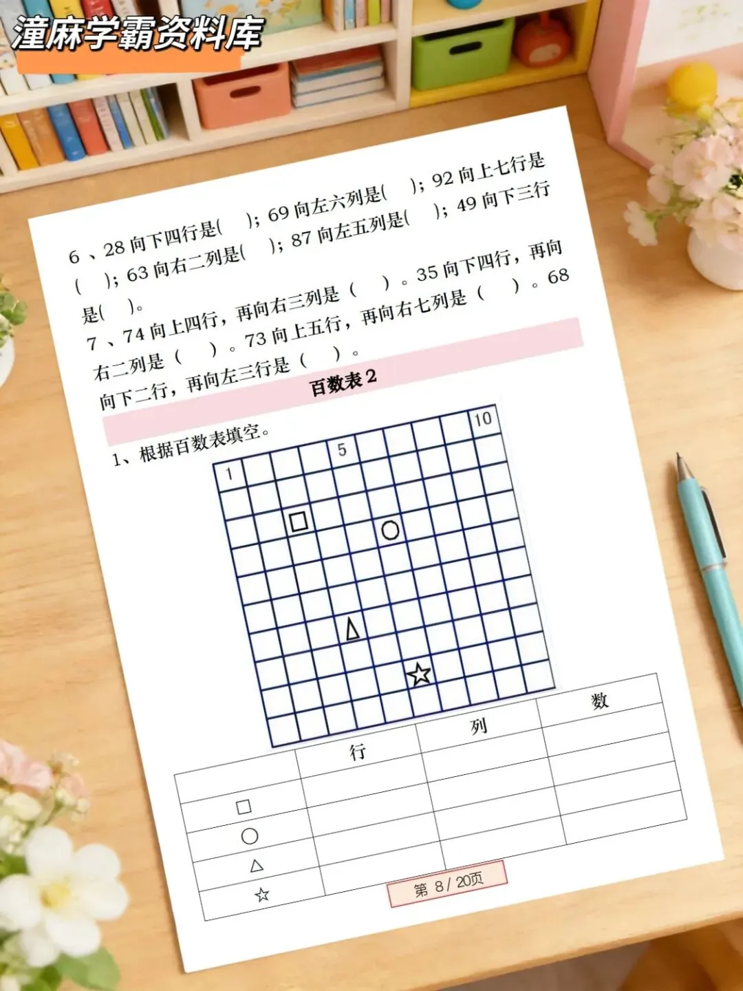 1. 先懂规律再做题:先对照百数表,让孩子亲手圈出上下、左右、斜向相邻数,直观感受差1、差10的规律,再动笔练习,避免机械记忆。