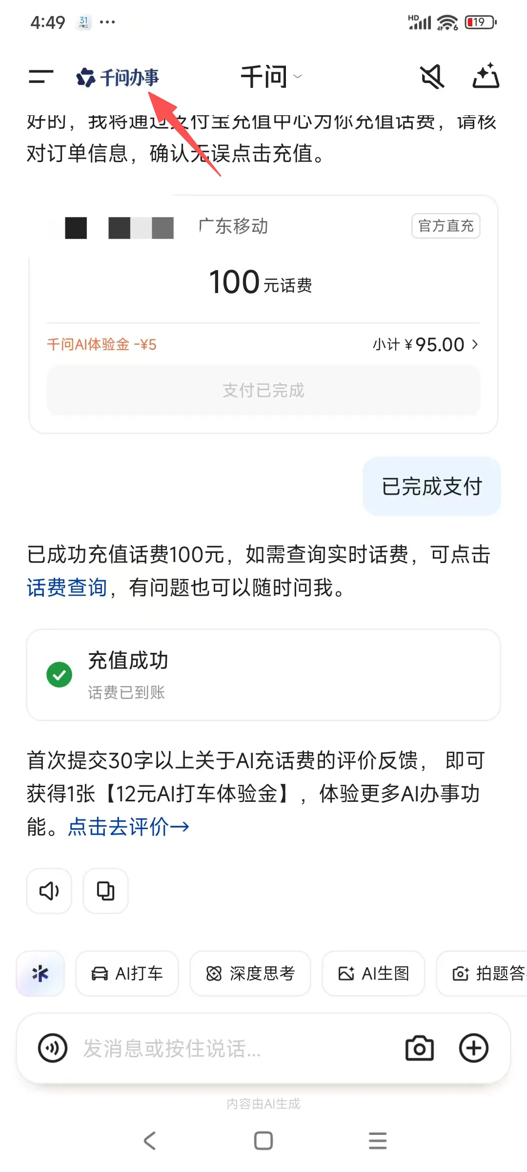 3)体验AI打车或充话费功能后,写评价反馈,再得AI打车券