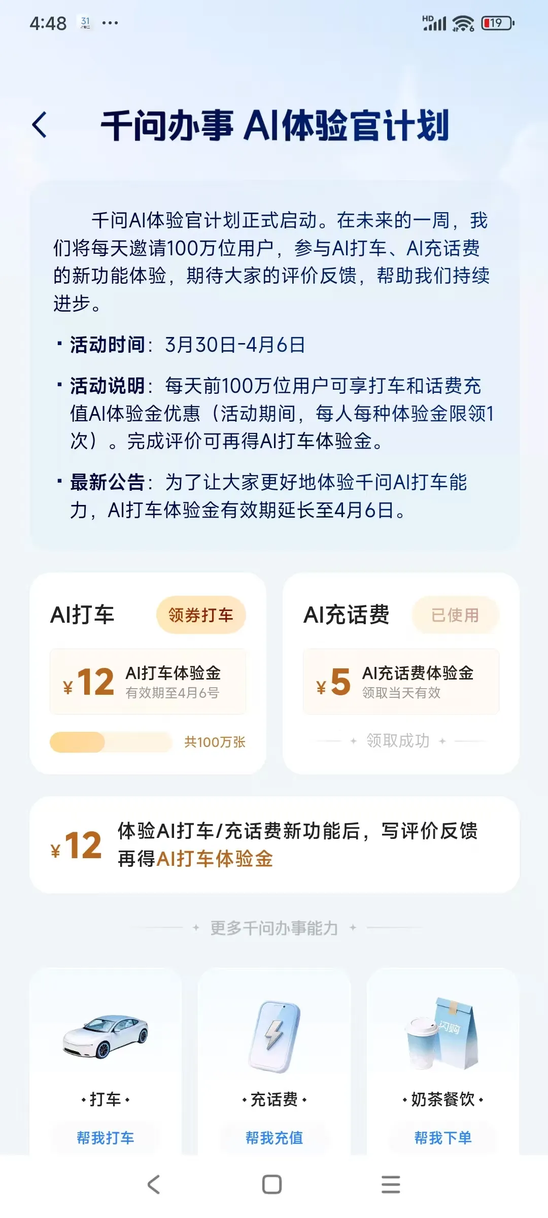前段时间阿里千问app刚请大家喝奶茶,现在又送12元打车券和5元话费券!
