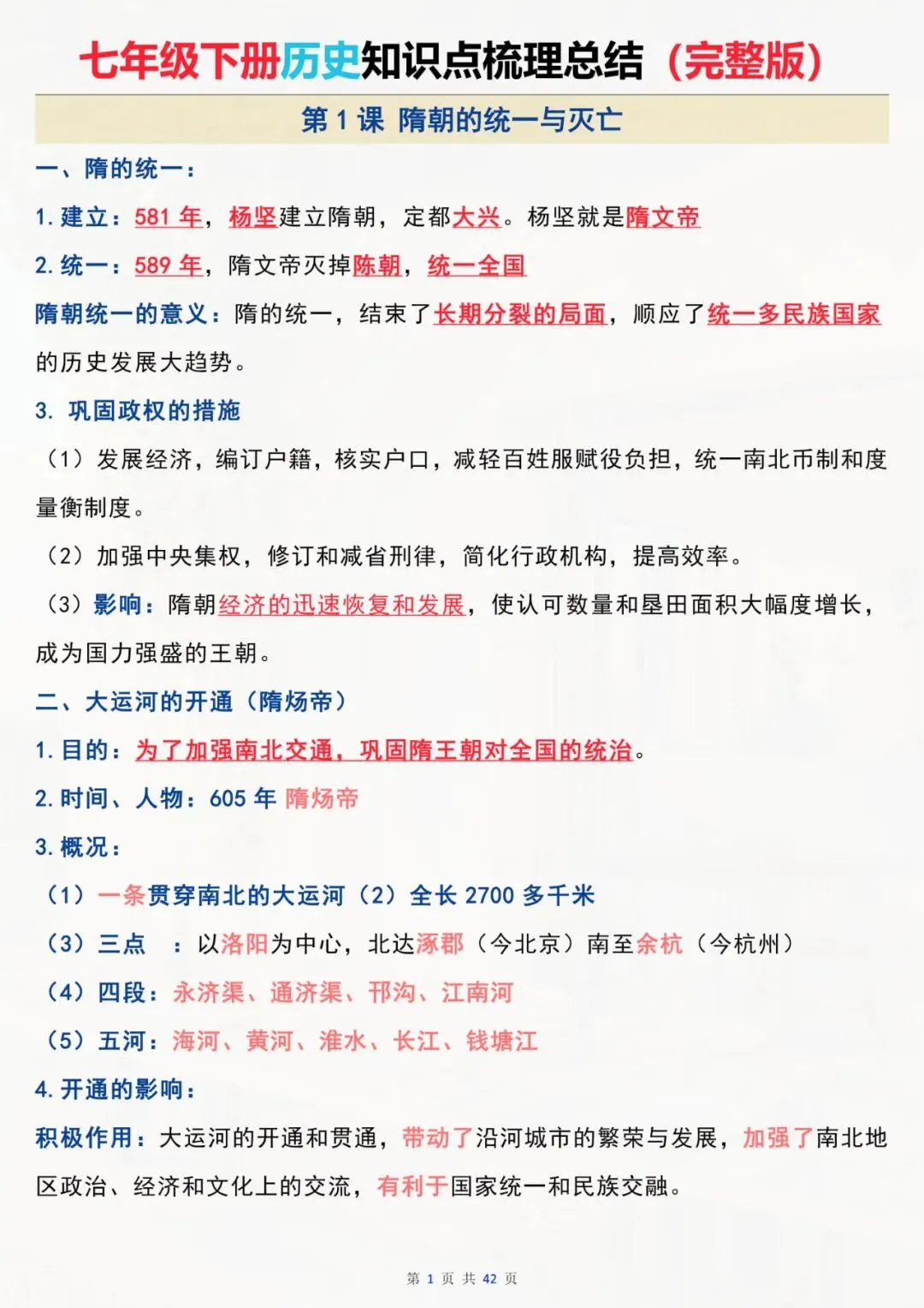 今天老师为大家精心整理好了:七年级下册历史 全册知识点总结 电子版可打印!