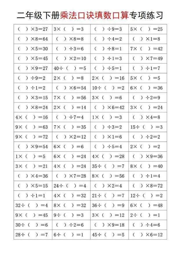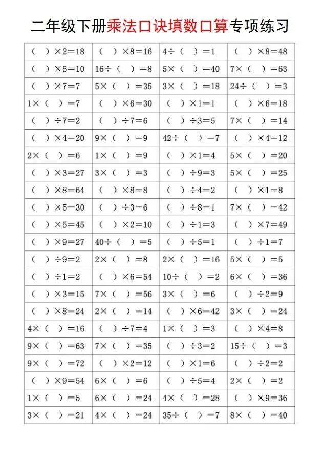 小学数学二年级下册《乘法口诀填数口算》|可下载打印 点击上方“语数英父母学堂”↑↑↑关注我 版面有限,不过多展示 需要直接拉至文末下载 完整电子打印版免费领取方式 ▲点击上方 语数英父母学堂 在公众号消息框发送: 5354,即可免费领取
