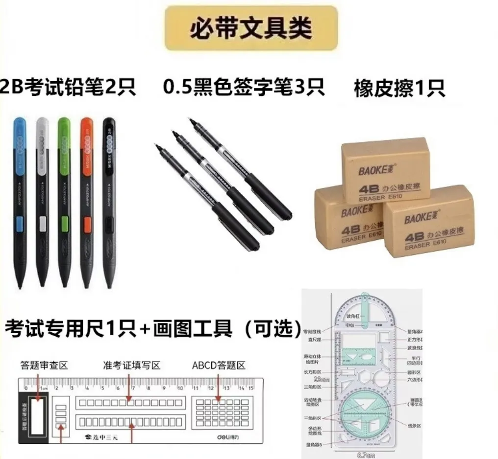 提前准备好考试相关文具,如2B铅笔、黑色字迹的钢笔或签字笔、马克笔、直尺、三角板、圆规、橡皮擦等,