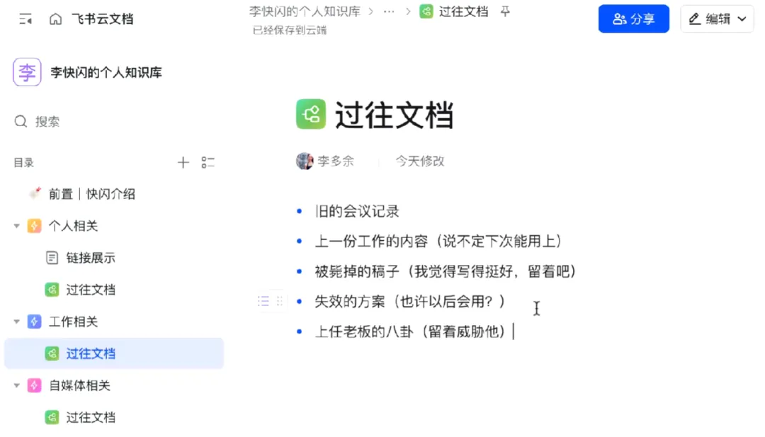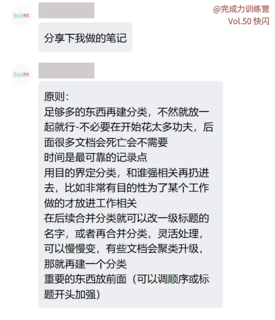 不需要在一开始就想好所有分类,先明确一个大框架(个人、工作、副业/学习),然后把文档按照相关性丢进去。