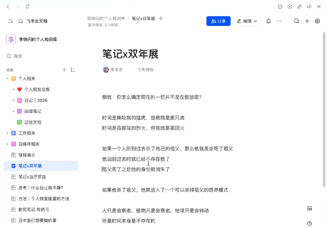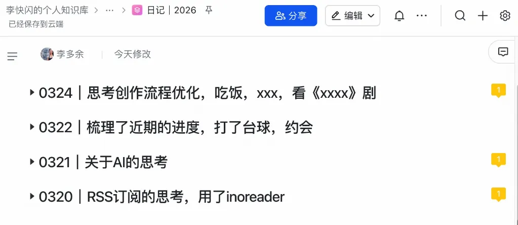 我的做法是,新建一个 日记 | 2026 的文档,在同一个文档里,用二级标题标记日期+标题/关键词,比如“0321|关于AI的思考”——这样以后翻起来,一眼就知道哪天写了啥。