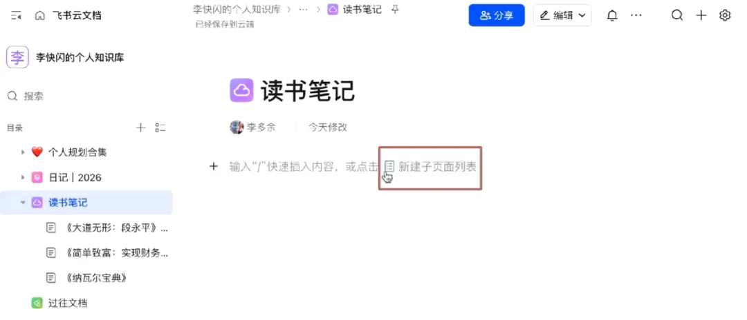这时,在 读书笔记 | 2026 这个页面里,你可以通过点击飞书“自动生成子页面列表”功能,为你的读书笔记自动创建一个目录。