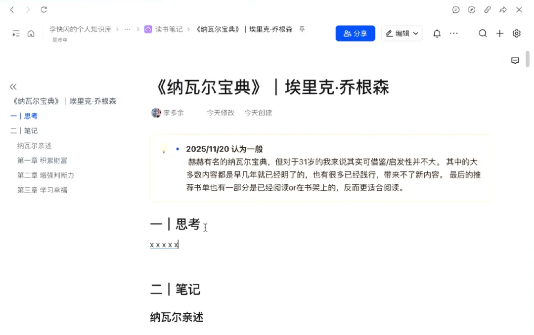 第三步:按照“思考+笔记”的格式,组织每一本书的笔记。