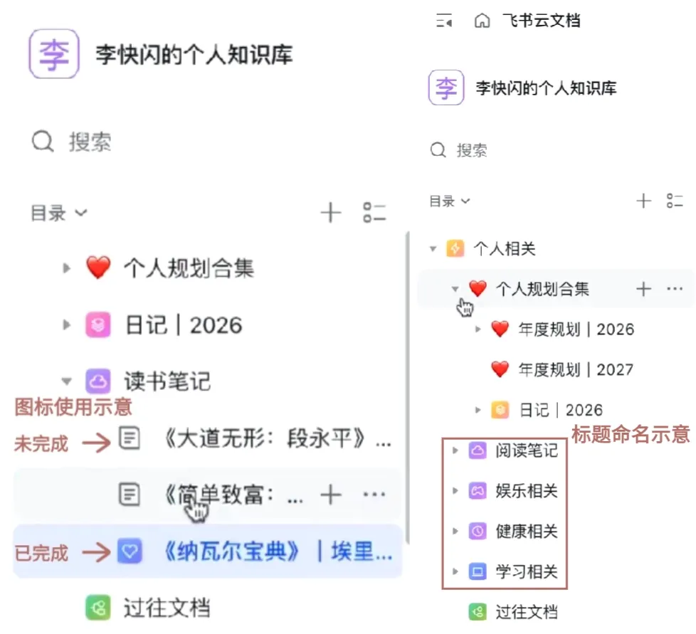 品类放文档标题前面:日记|2026、日记|2027——这样以后所有日记都排在一起,好找。