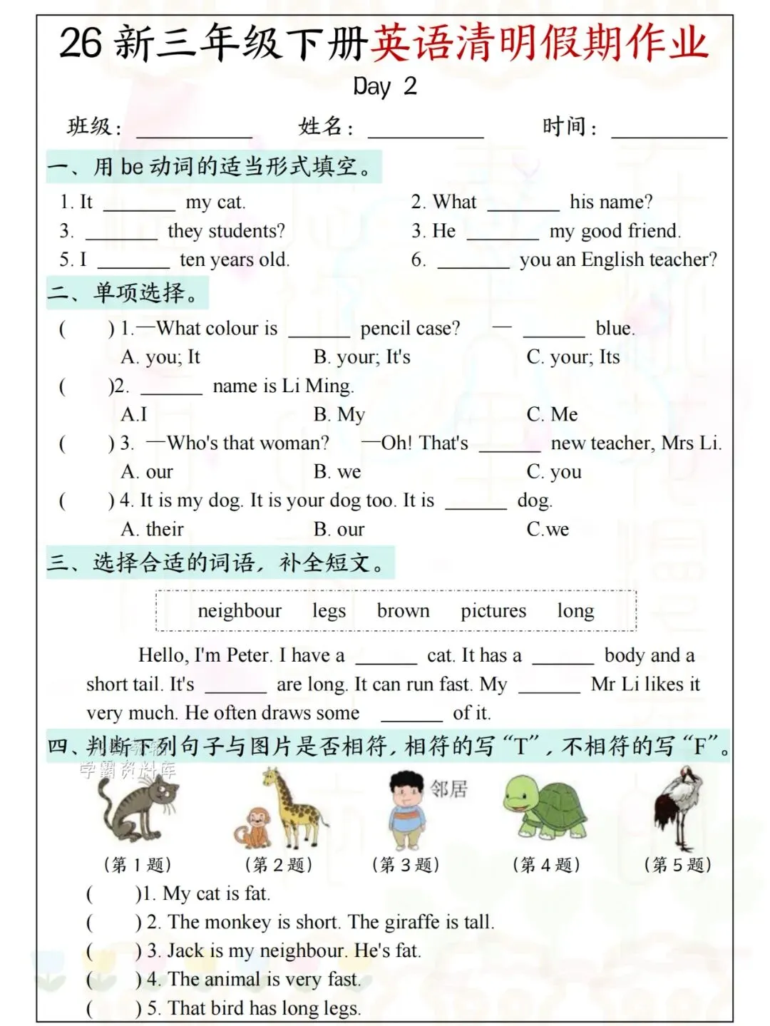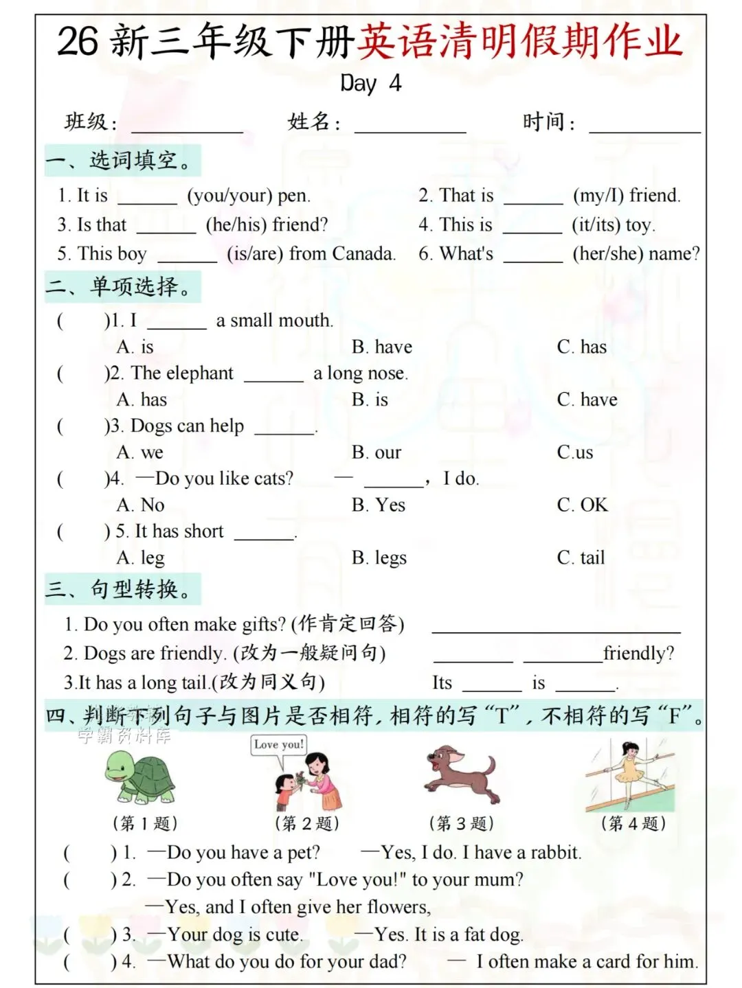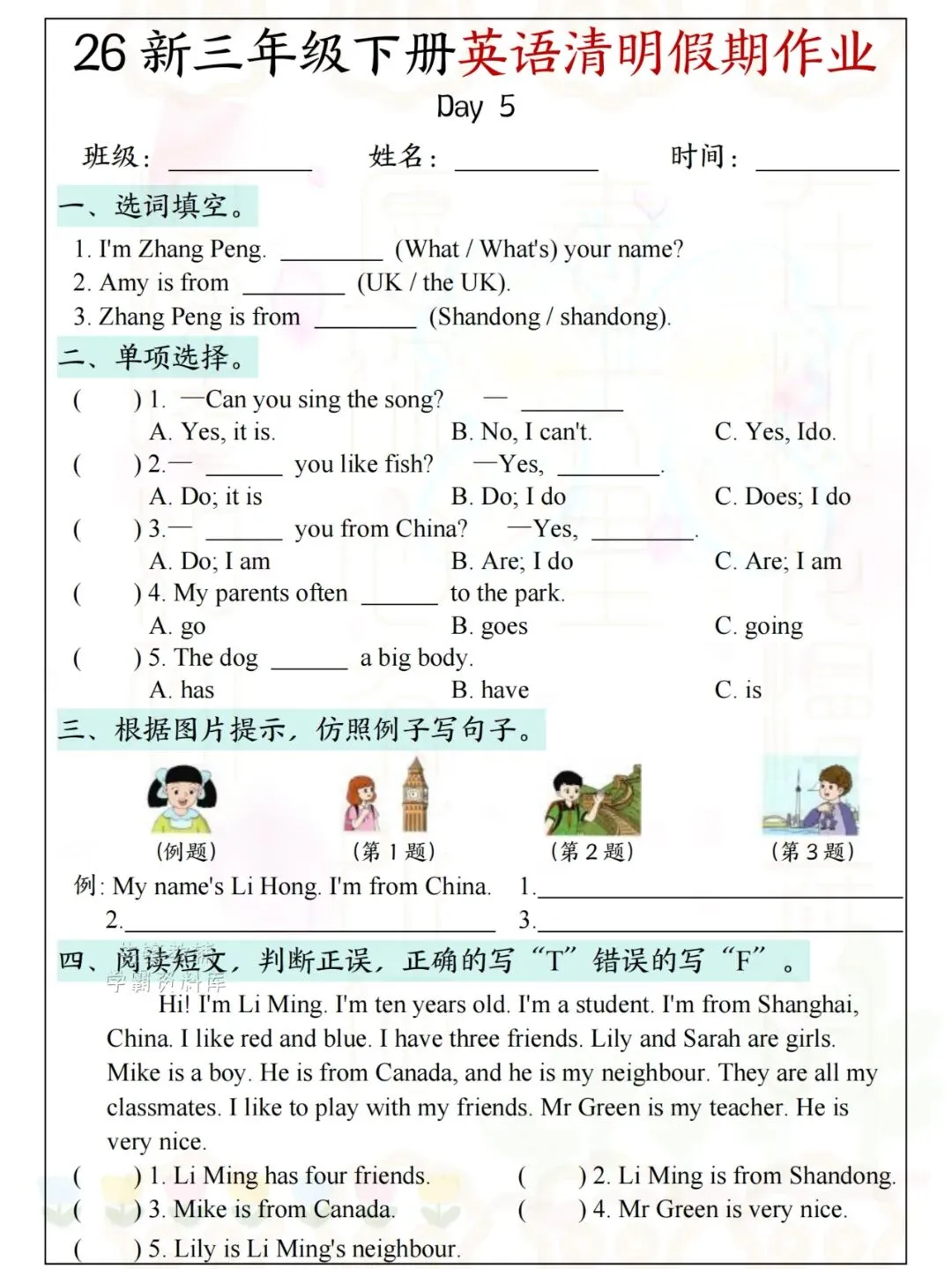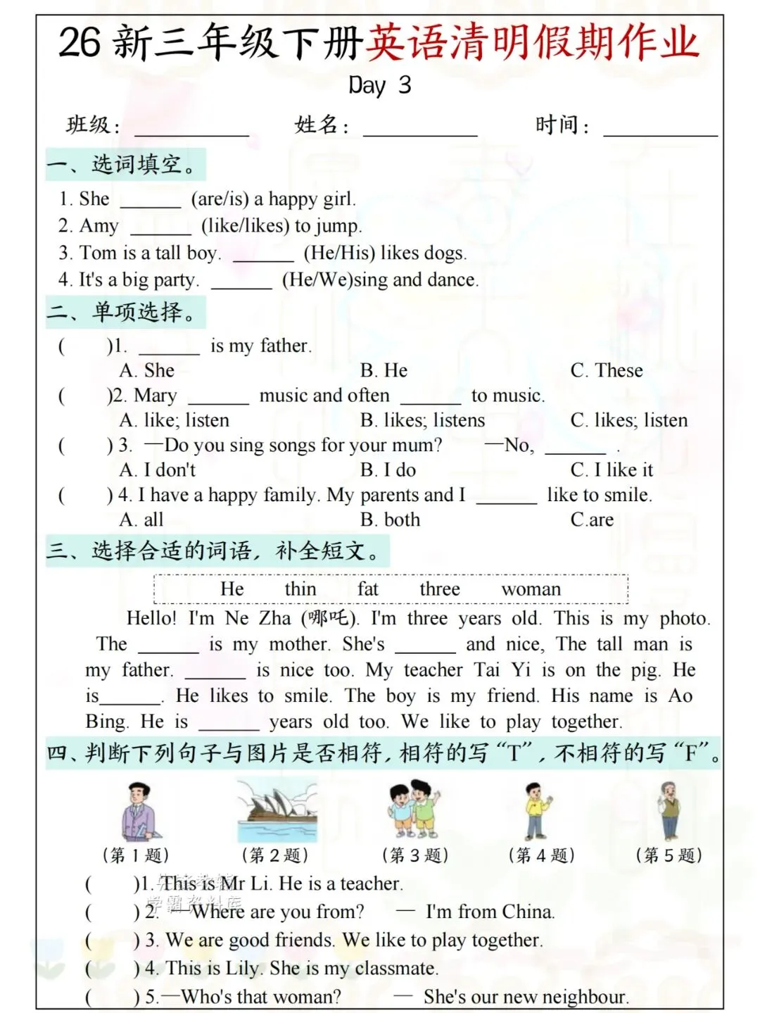 26新三年级下册英语清明假期作业 电子版可下载可打印