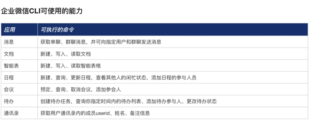企业微信CLI的安装与使用十分简便。开发者只需通过npm完成CLI安装,再配置好企业微信机器人的Bot ID和Secret,便可调用相关功能。目前,项目已配备消息、会议、待办、日程、文档、智能表格等一系列实用技能,助力开发者迅速上手开发。