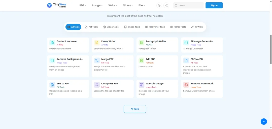简单说,它就是个免费在线工具集合站。200多个工具,覆盖PDF、图片、视频、AI写作、文件转换五大类。