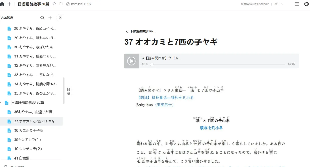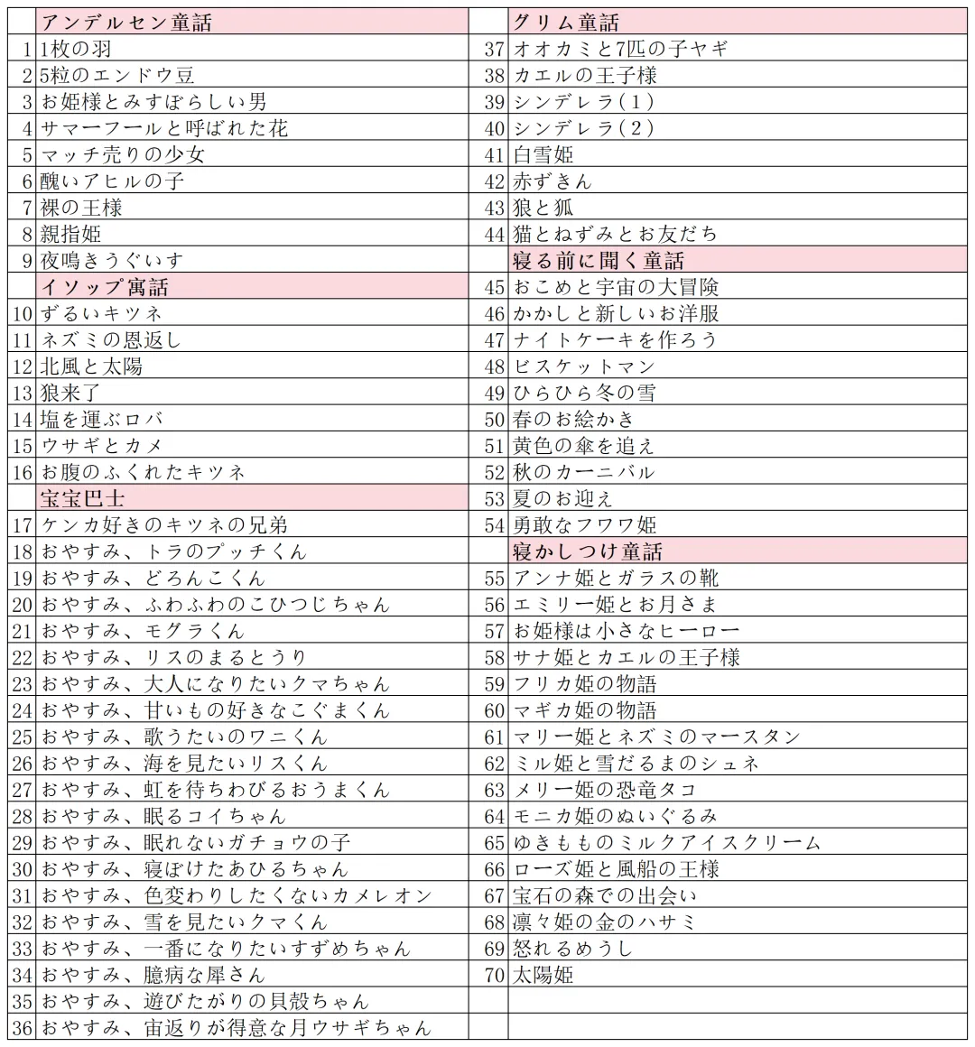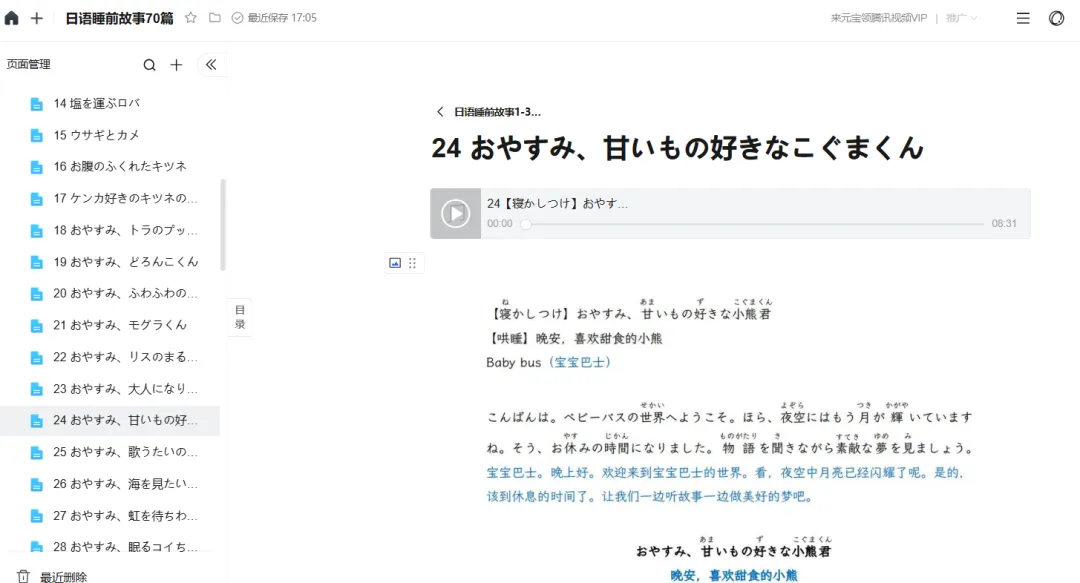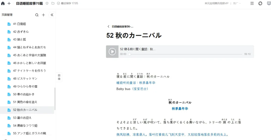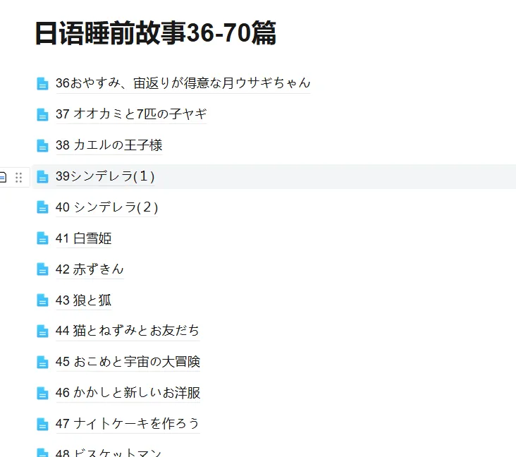 本素材一共70个故事 故事独立不重复,尤其音频一绝, 日本声优录制的,超级适合练听力和睡前磨耳朵。 目录页供参考