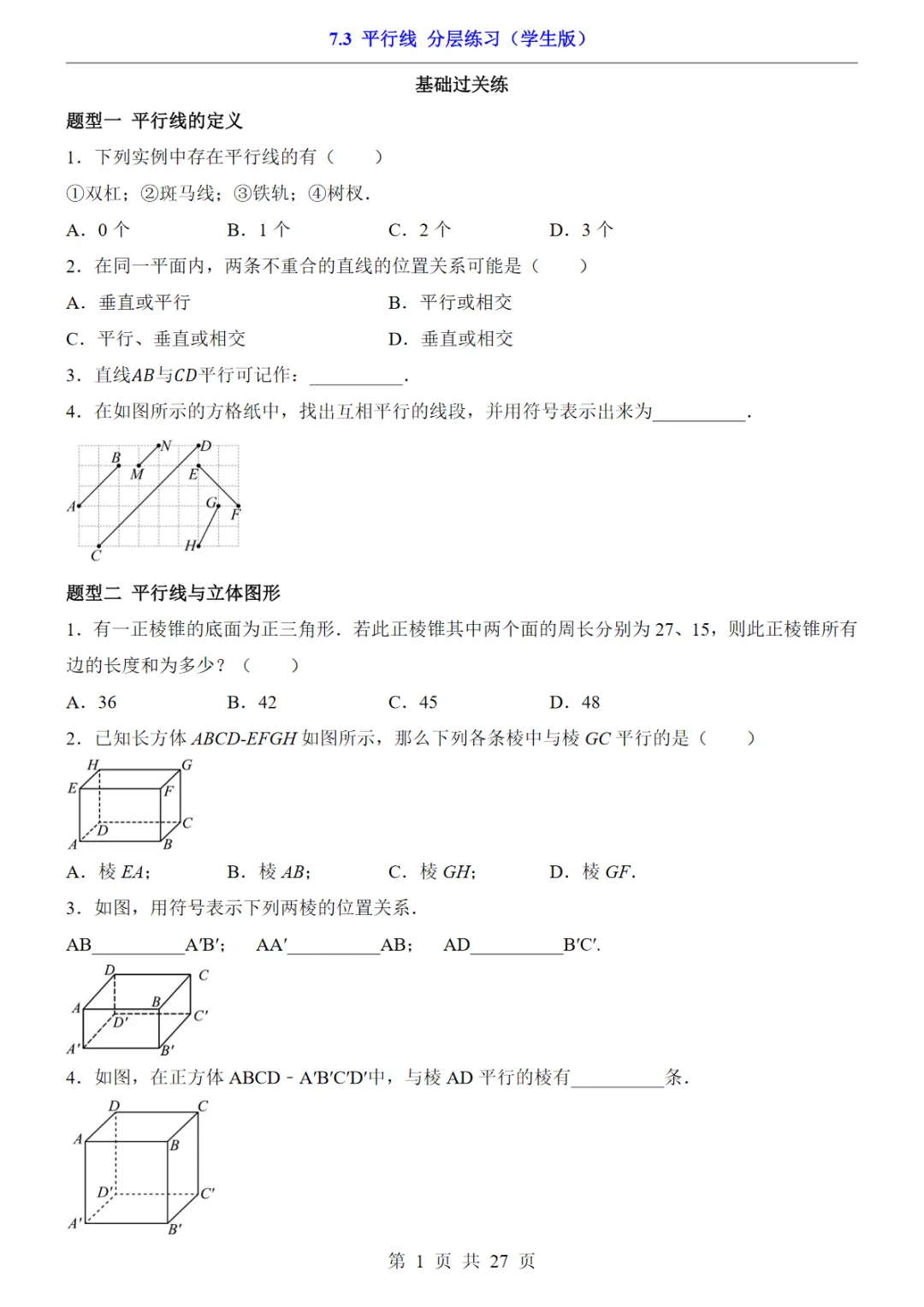 【免费下载】七年级(下)数学7.3平行线 分层练(冀教版),PDF电子版,可打印