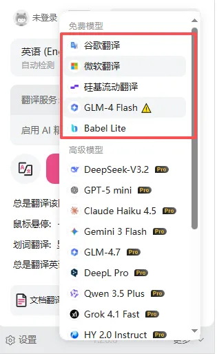 💡 推荐配置:一般翻译使用微软翻译即可,国内可用,模型翻译:除了谷歌翻译,其他都国内可用