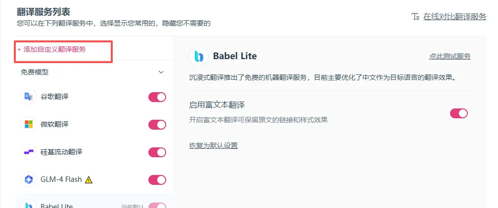 Step 1:点击沉浸式翻译图标 → 「设置」→「翻译服务」→ 选择添加自定义翻译服务