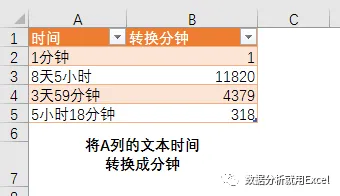 如下图所示,将A列的文本时间转换成分钟。