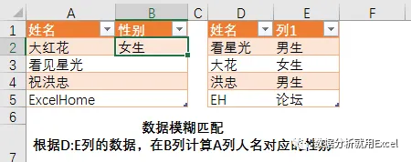 如下图所示,需要根据D:E列的数据,计算A里人名的性别。需要注意的是,D列的人名和A列的人名并非完全对应,例如看见星光和看星光。