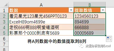如下图所示,需要将A列数据中的数值提取到B列,数值的分布很零散,基本无规律可循。
