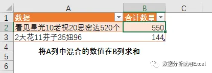 如下图所示,需要将A列混合文本中的数值部分在B列汇总求和。