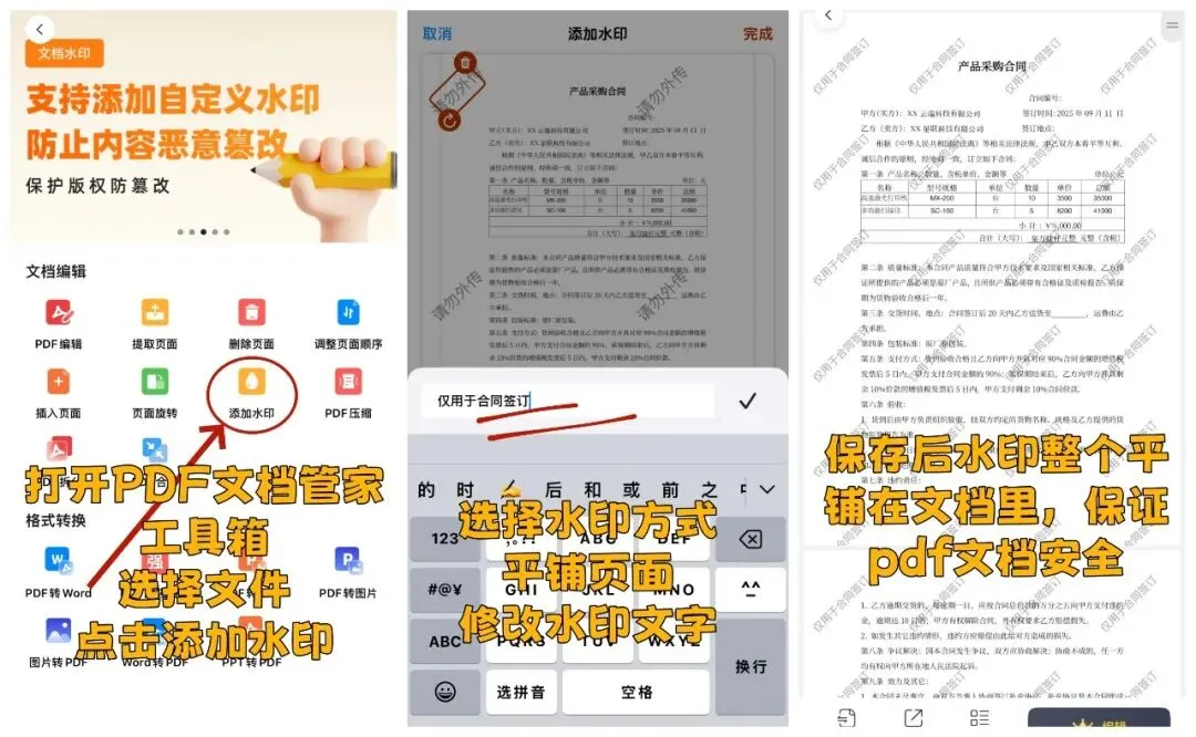手机一键加钢印: 打开小程序,把方案导进去,输入“仅限XX公司内部审阅”或者你自己的名字。一秒钟,整个文件瞬间铺满了半透明的保护水印。