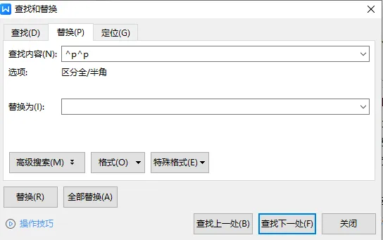 查找内容那里会出现段落标记(^p),然后再点一下段落标记(^p),最后就会出现如图所示2个段落标记(两个段落标记,代表连续2个空行)