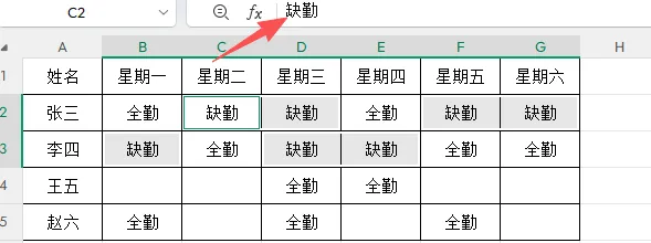 这一步直接收尾,操作超简单!根据你的需求,在Excel上方的编辑栏中,输入你想插入的内容——如果是填充同一固定内容(比如“缺勤”),直接输入即可。