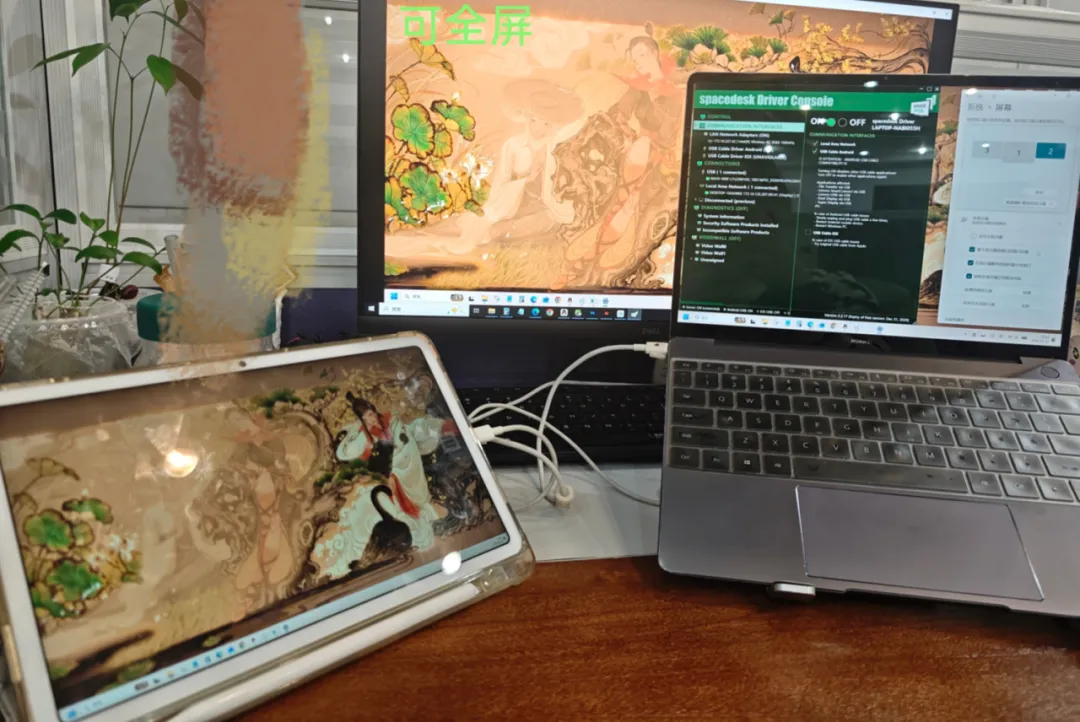 支持无线扩展屏幕,平板手机同时支持通过数据线连接。两种方式都实时同步,延迟低,1080p分辨率下也能流畅显示