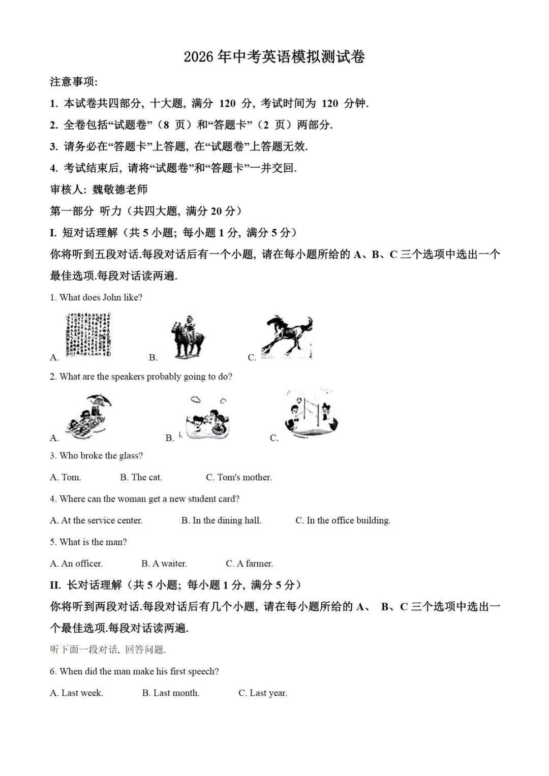 【免费下载】2026年中考英语模拟测试卷(含答案)PDF高清电子版,可打印,先保存后下载